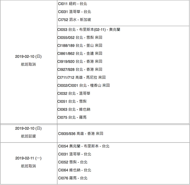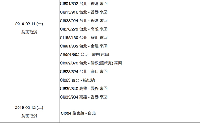 华航公布11日取消航班分别为CI031温哥华-台北、CI052悉尼-台北、CI064维也纳-台北、CI076罗马-台北。下午新增的23航班分别为:CI601/602台北-香港来回、CI915/916台北-香港来回、CI923/924台北-香港来回、CI278/279台北-高松来回、CI188/189台北-釜山来回、CI861/862台北-金边来回、AE991/992台北-厦门来回、CI069/070台北-伦敦(盖威克)来回、CI523/524台北-海口来回、CI063台北-维也纳、CI839/84高雄-曼谷来回、CI933/934高雄-香港来回。12日CI064维也纳-台北航班也遭取消。