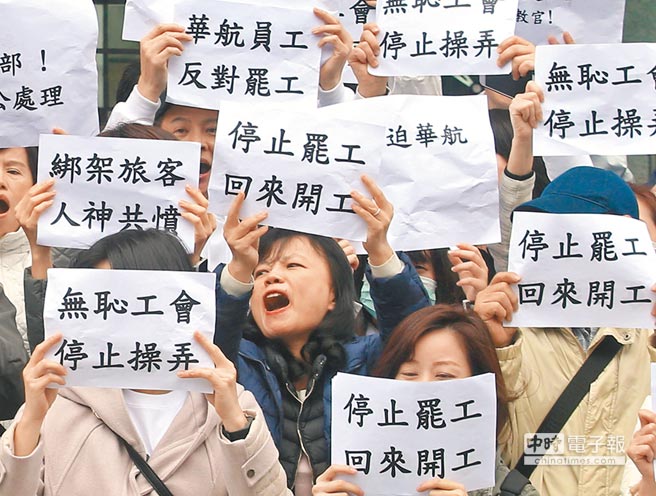 据报道,机师连日罢工也导致华航其他单位员工忙翻,不仅要签转、抓飞,还要安抚第一线旅客。昨有逾百名华航员工至台当局“交通部”抗议,高喊“停止罢工、回来开工”“绑架旅客、人神共愤”“长荣人滚出华航”,要求“交通部”不要同意工会诉求。