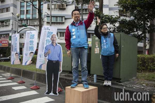 郑世维说,定点拜票或活动一般都会把韩国瑜的分身请出来,毕竟“空战”“韩流”的效应比较大。郑世维强调,他透过高雄副市长李四川、高雄市议员与其他友人向韩国瑜联系,韩表示,不用担心一定会到。至于什么时候到?郑说,韩国瑜现在市政忙碌又有灯会,需要给韩一点时间,选战还有5周,韩国瑜一定会择一个日期北上为他站台。