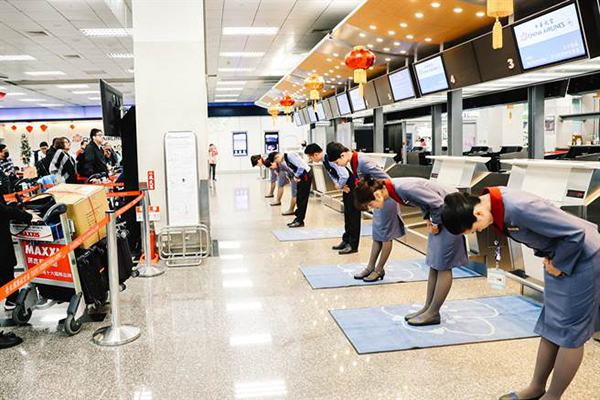 图为台湾松山机场华航柜台,服务人员向旅客鞠躬敬礼。(图片来源:台湾“中时电子报”)
