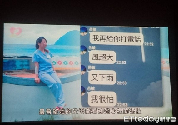 蔡邑敏去年2月5日在执行转送病患任务时坐上黑鹰直升机,她传信息给家人说,“降不降的下来还不知道”“风超大又下雨”“我很怕”,没想到这些最后竟成遗言。(中国台湾网 贾若澜)