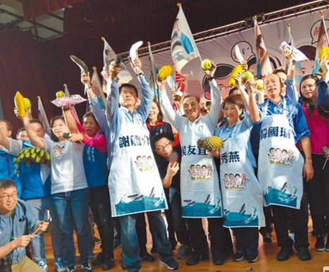 韩国瑜、侯友宜、卢秀燕为谢龙介站台,要促销台湾农特产,希望帮台湾的乡亲“拼经济”。(图片来源:台湾“中时电子报”)