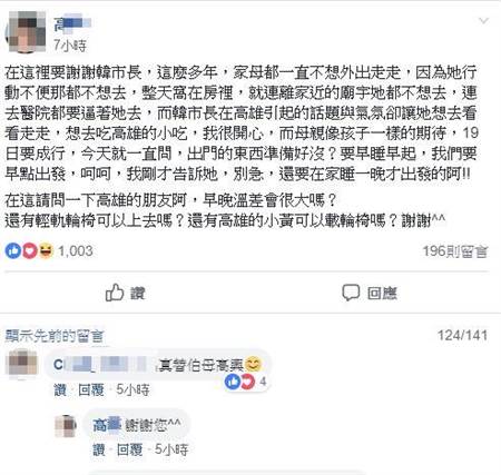 然而,近日来,韩国瑜在高雄引起的话题与气氛却让她妈妈想去看看走走,想去吃高雄的小吃,“母亲像孩子一样的期待,19日要成行,今天就一直问,出门的东西准备好没?要早睡早起,我们要早点出发”。该网友也向高雄网友问及,早晚温差会不会很大、轻轨轮椅可否上去、高雄的小黄能不能载轮椅等问题。