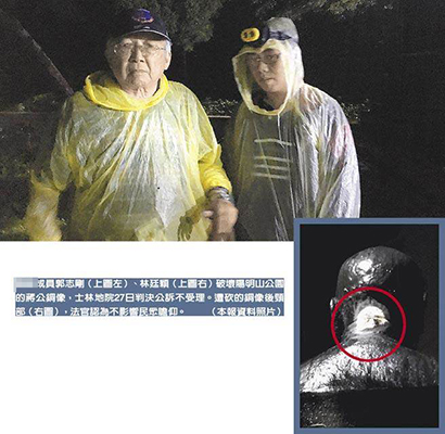 “独派”成员郭志刚(上图左)、林廷颖(上图右)破坏阳明山公园的蒋介石铜像,士林地院27日判决公诉不受理,被台湾“高等法院”打脸发回更审。(图片来源:台湾“中时电子报”)