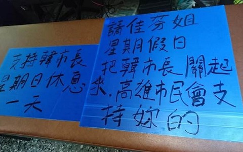 抗议的牌子上写着“支持韩市长星期日休息一天”,“请佳芬姐星期假日把韩市长关起来,高雄市民会支持你的!”其他人也留言“你!!!好样的!!!”“我们都同意佳芬姐星期日把市长关在家睡觉”“一周要龟息一天,晚上八点必须回家休息”。(中国台湾网 娟子)