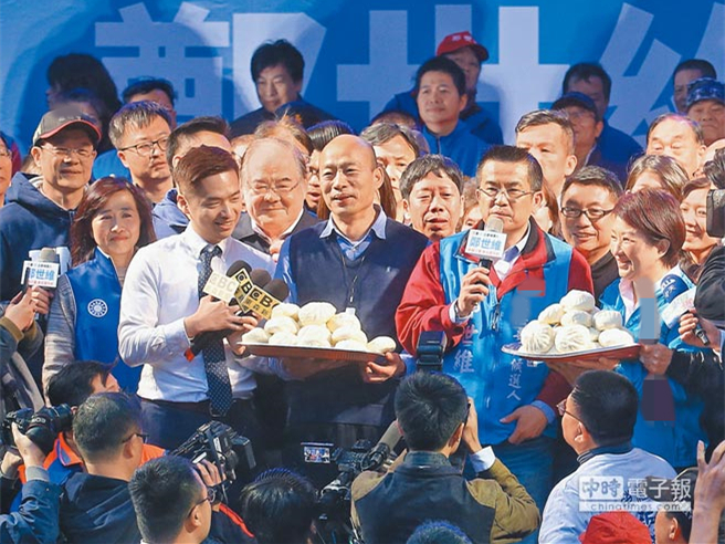 新北市三重“立委”补选国民党参选人郑世维(前排右二)23日造势活动,高雄市长韩国瑜(前排右三)与台中市长卢秀燕(前排右)合体送包子。(图片来源:台湾“中时电子报”)