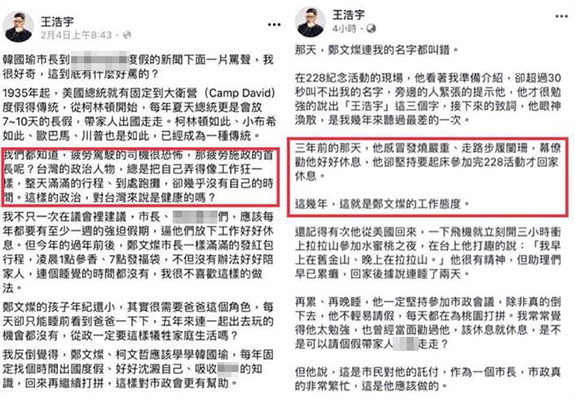 一个月前,王浩宇在脸谱网上呼吁政治人物应该适度休息;一个月后,为了酸韩国瑜,王浩宇竟大赞郑文灿的工作态度。(图片取自台媒)