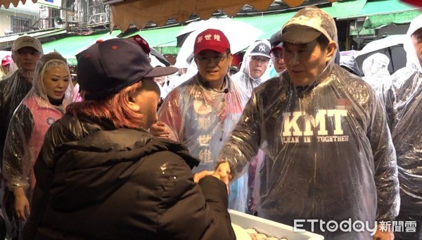 马英九今晨陪同三重区“立委”补选候选人郑世维前往龙门市场扫街拜票。(图片来源:台湾“东森新闻云”)