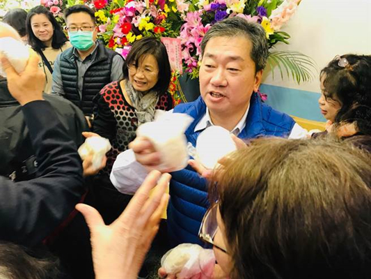 国民党基隆市党部主委黄希贤的“立委”初选服务处今(12)日正式成立,黄希贤在现场发放包子,响应高雄市长韩国瑜的热潮。(图片来源:台湾“中时电子报”)