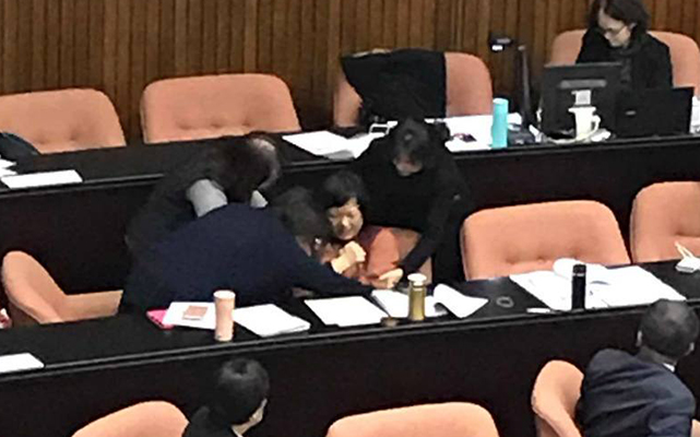 “行政院交通环境资源处处长”陈盈蓉在“立法院”议场疑因身体不适,在官员席上发出尖叫声。(图片来源:台湾《联合报》)
