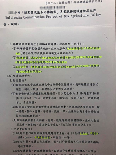 根据报告内容,该案原本是“媒体舆情观测服务”,厂商要进行舆情分析、议题声量及趋势分析,并替“农委会”制作倡导素材,不过去年追加190万经费后,工作内容变本加厉,要厂商在各大媒体平台如脸谱网、YouTube、LINE进行“倡导”,且得标厂商还是“进驻”“农委会”上班。