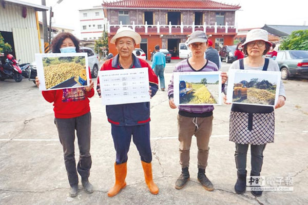 图为麻豆区柚农郭新聪(左二)受访,拿出去年10月文旦(柚子)倾倒在田地照片,证明去年文旦确实滞销。(图片来源:台湾“中时电子报”)
