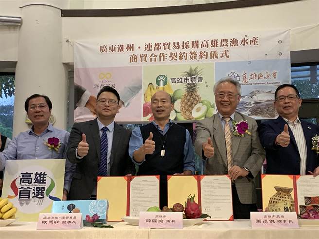 19日,在高雄市长韩国瑜(中)见证下,广东潮州连都贸易公司董事长欧德壮(左二)与高雄市农会理事长萧汉俊(右二)、高雄区渔会理事长谢龙隐(右一)签下1年采购10亿(新台币)农渔产品订单。(图片来源:台湾“中时电子报”)