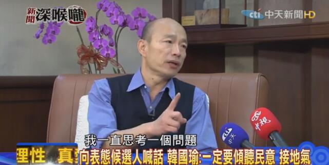 韩国瑜日前接受《新闻深喉咙》专访时,对于选不选2020,他语重心长表示“我怎么对高雄280万市民交代?”他更表示,从未与吴敦义讨论过征召问题。平秀琳问,若吴敦义口中的“万分之一征召机会”真的发生了,那你是否有想过要怎么回应,回应高雄市民、回应全台民众?