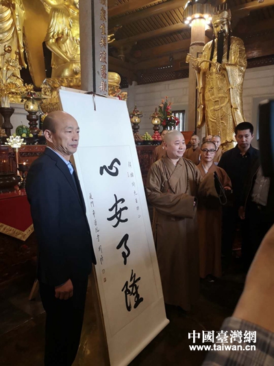高雄市长韩国瑜27日一早赴厦门南普陀寺参拜,大陆佛教协会副会长则悟法师特赠一幅“心安事隆”墨宝。(中国台湾网版权图片)