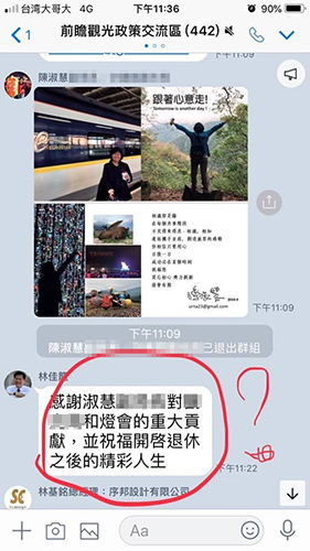 台当局“交通部观光局副局长”陈淑慧退休昨天退出LINE群组,“交通部长”林佳龙留言“祝福”。(图片取自台媒)