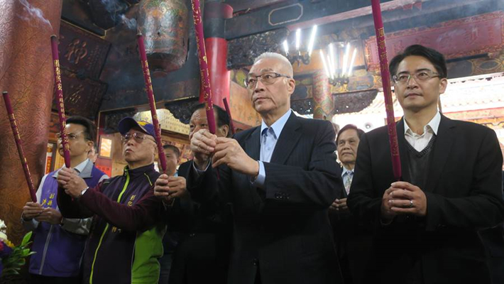 国民党主席吴敦义1日上午到鹿港护安宫与妈祖玻璃庙台湾护圣宫两地参拜(图片来源:台湾“中时电子报”)