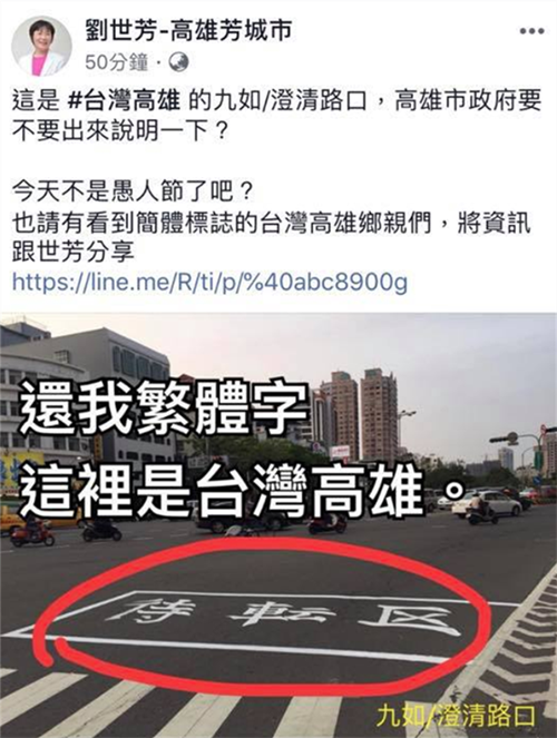 刘世芳指控九如澄清路口的“待转区”三字竟然是简体字,并要求高雄市政府出来说明,“今天不是愚人节了吧?也请有看到简体标志的台湾高雄乡亲们,将信息跟世芳分享”。经网友指正后,刘世芳又悄悄将“简体”两字修改成“非繁体字”。
