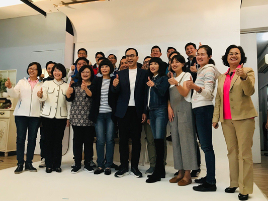 前新北市长朱立伦(前排中)今(3日)下午拍摄2020宣传照,新北市议会党团前来声援并拍摄合照,大家大喊“阿伦加油”(图片来源:台湾“联合新闻网”)