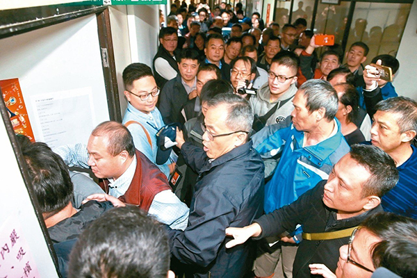 渔民不满看直播无法表达心声,前往主会场但遭阻挡后发生推挤冲突,最后气愤离席。(图片来源:台湾《联合报》)