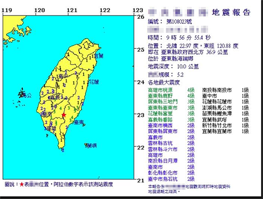 台东今天上午9点56分发生里氏规模5.2级地震,震中在台东县政府西北方36.9公里,震源深度10公里。(图片取自台媒)