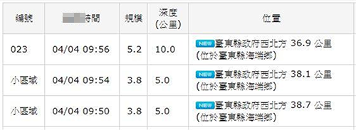 台东县今晨连续发生三次地震 最大规模里氏5.2级