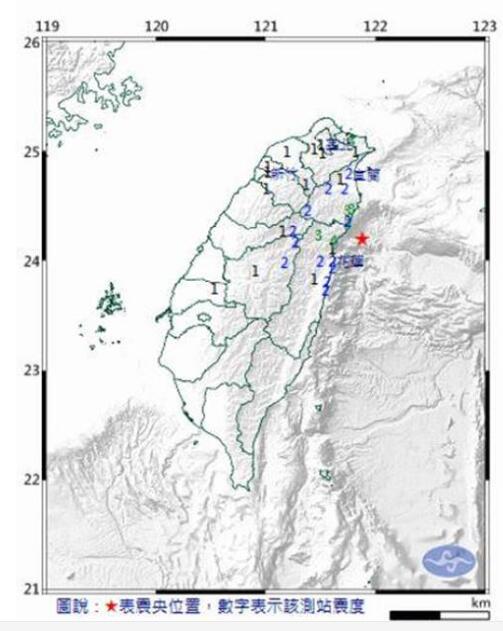 中国台湾网4月10日讯 据台湾“中央社”报道,根据台湾气象局最新信息,今天(10日)早上6时57分,台湾东部海域发生4.9级地震,地震深度24.8公里,震中位于花莲县政府东北方33.7公里(位于台湾东部海域),最大震度花莲县太鲁阁4级。据台湾“中时电子报”报道,台北地区明显感受到好几秒的摇晃。
