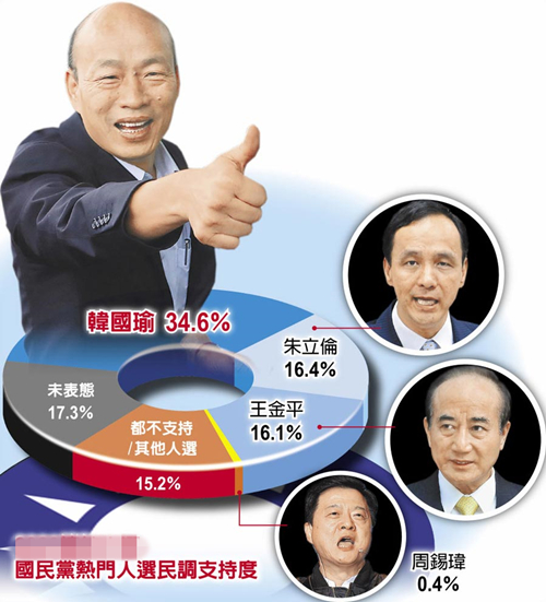 国民党最新民调显示,韩国瑜支持度胜过朱立伦王金平总和。(图片来源:台湾“中时电子报”)