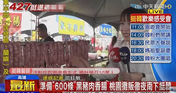 “韩粉”自发在凤山举办市民感受联谊欢乐大会,力挺高雄市长韩国瑜选台湾地区领导人。现场再度摊商云集,民众熟悉的“香肠瀑布”也没缺席。(图片取自台媒)