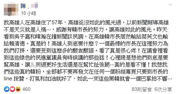 中国台湾网5月7日讯 据台湾“中时电子报”报道,台湾“美丽岛电子报”董事长吴子嘉昨日(6日)在广播节目中提及最新民调,并称高雄市长韩国瑜若参选2020,无论对上赖清德或蔡英文,在高雄市皆输3%至4%。对此,有名网友表示,她在高雄住了57年,“高雄从没如此的风光过!”并表示看到韩国瑜打拼还要受到这么多的酸言酸语,很心疼!