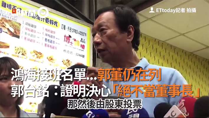 中国台湾网5月10日讯 据台湾“东森新闻云”报道,鸿海集团董事长郭台铭宣布角逐2020后,鸿海接班人选引发外界关注。鸿海集团10日宣布最新6席一般董事改选提名名单,郭台铭也入列,不过郭台铭强调,未来“绝对不会当董事长,证明参选到底的决心。”