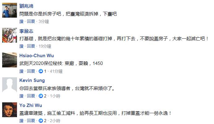 不过台湾网友对此并不买账。有网友表示,蔡英文根本没在盖房子,而是在拆房子,把台湾的经济基础都拆掉;也有网友批评,蔡盖违章建筑,施工偷工减料,给再长工期也没用,打掉重盖才能一劳永逸!(中国台湾网 高旭)