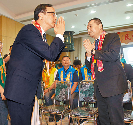 朱立伦(左)与侯友宜(右)至土城慈法禅寺参加浴佛节,两人先后到场短暂寒暄。针对赖清德批韩国瑜提出的自贸区说帖,朱立伦反讽,“赖‘院长’记忆不太好”,赖清德担任台南市长就已经在谈自经区。(图片来源:台湾“中时电子报”)