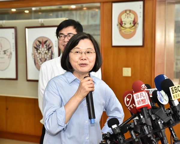 蔡英文19日到高雄市内门南海紫竹寺参拜,会后接受媒体访问。(图片来源:台湾“中时电子报”)