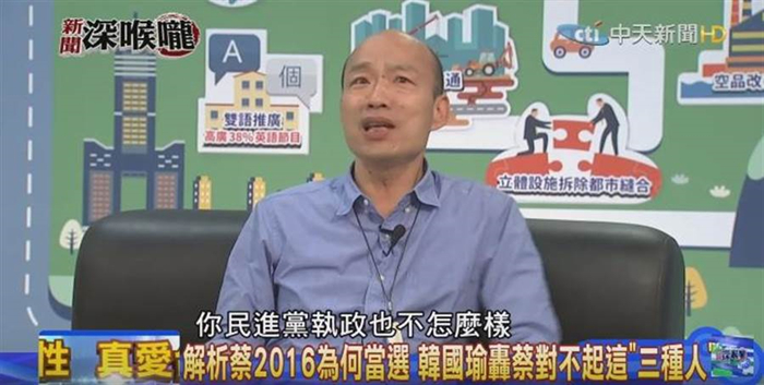 韩国瑜受节目《新闻深喉咙》专访表示,三年前,投给蔡英文的只有三种人。第一,讨厌国民党:看到国民党就投不下去!第二,希望台湾“独立”:支持你蔡英文,赶快“独立建国”!第三,我希望过好日子:国民党执政我没有把握,民进党可以给我带来好生活!“这三种人把票投给蔡英文,我都帮蔡英文分析好了!”