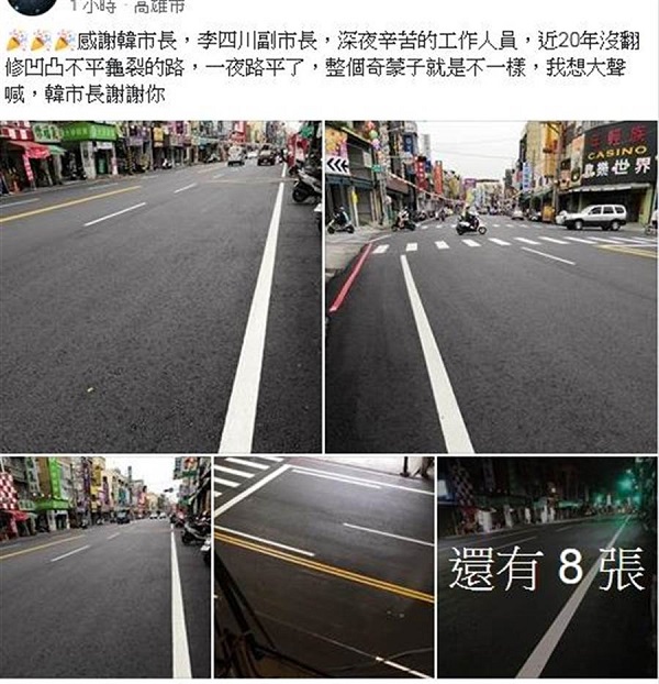 一位网友在“韩国瑜后援会”PO出多张凤山区五甲道路照片,感谢辛苦的工作人员,让凹凸不平龟裂的路,一夜路平了。(图片来自台媒)