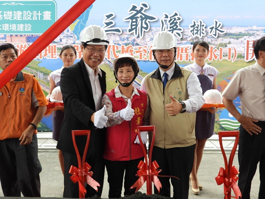 黄伟哲(右)今(24日)参加三爷宫溪整治工程动土,对赖清德的“让步方案”提出看法。(图片来源:台湾《联合报》)