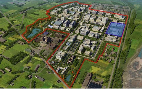 红色框线为和发园区范围,右上方蓝色方块是鸿海购买土地。(图片来自台媒)