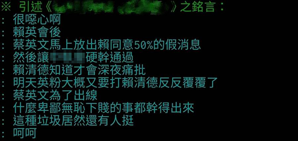 有网友也在PTT论坛直言:“很恶心啊,‘赖英会’后,蔡英文马上放出赖同意50%的假消息,然后让‘中执会’硬干通过,赖清德知道才会深夜痛批。明天‘英粉’大概又要打赖清德反反复覆了。蔡英文为了出线,什么卑鄙无耻下贱的事都干得出来,这种垃圾居然还有人挺,呵呵。”