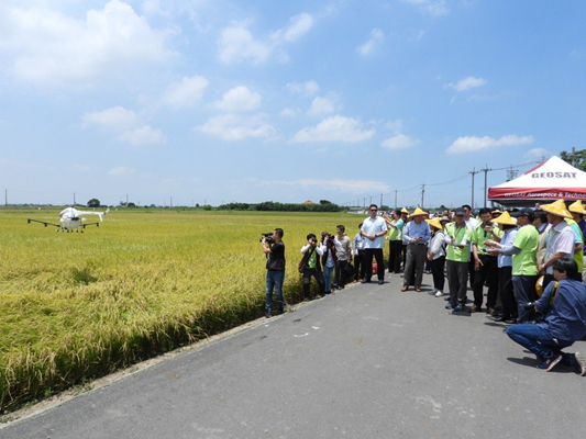 蔡英文今(31日)到芳荣米厂参访,参观一旁稻田无人机喷洒农药作业过程,随后与在地农民与地方人士座谈。(图片来源:台湾“中时电子报”)