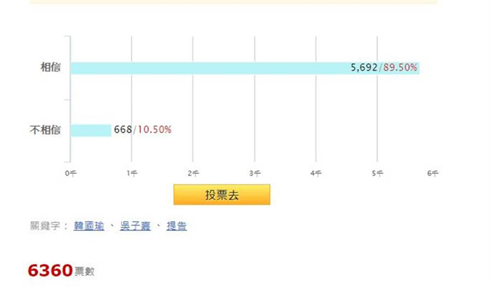 对此,台湾《中时电子报》昨举行网络投票,询问网友“你是否相信韩国瑜的清白?”至今日上午七点止有达约9成的网友相信韩国瑜,仅1成的票数不相信。
