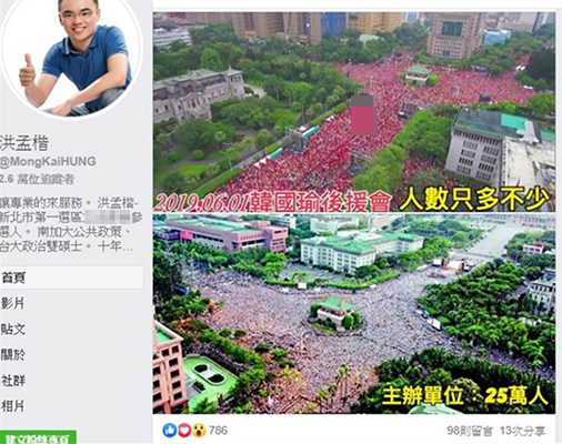 洪孟楷在脸谱网(facebook)指出:对比5年多前“白衫军”号称25万人上街头,隔天报纸报道有20万人,一样的面积场景,1日韩国瑜的造势对比只多不少,要不就是当年白衫军灌水灌很大、不然就是现在绿营在半夜吹口哨壮胆。