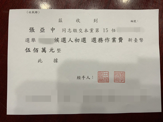 中国台湾网6月6日讯 据台湾《联合报》报道,国民党下周一公布2020初选名单。台湾大学政治系教授张亚中今(6日)上午10时整,委托秘书到国民党中央缴交5百万(新台币,下同)选务作业费,其中2百万现金3百万本票(253万与47万各一张),组发会与财务室现场完成点收,确定已取得参选资格。