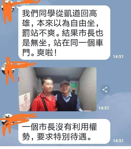 有网友在底下发文表示,一名韩粉的朋友在参加完6月1日韩国瑜凯道造势大会后,想要搭乘高铁自由座回家,原本以为会有位子,没想到人数众多,只能一路站回去。这名朋友本来还因没位子坐而不开心,没想到转头一看,竟发现韩国瑜就跟他站在同个车厢,让他当场惊讶,一个市长居然没有利用权势要求特别待遇,而是跟一般庶民一样搭乘大众运输回家,也没有因为自己的身份地位要求座位,非常平民的跟着大家站在车门。(中国台湾网 李宁)