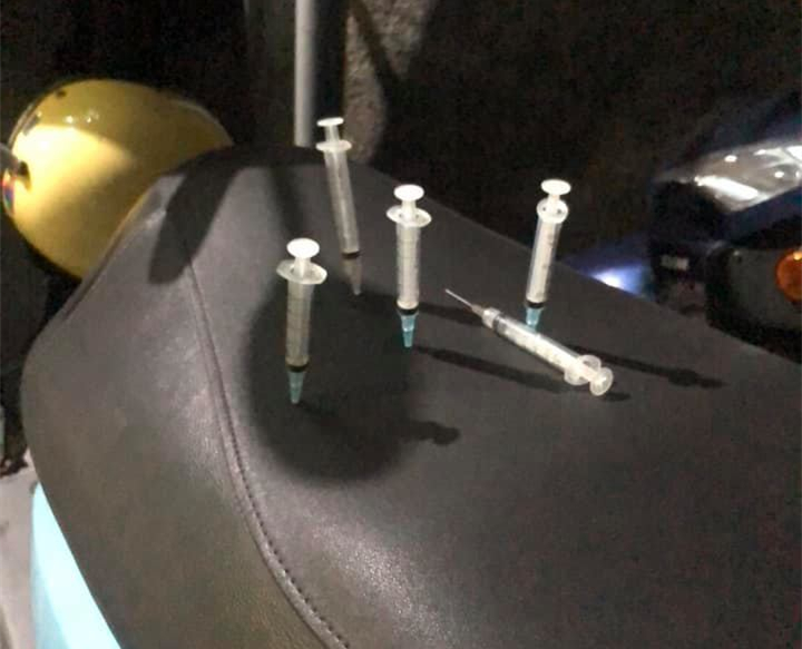 中国台湾网7月20日讯 据台湾《联合报》报道,基隆市一名摩托车车主把车停路边,今天凌晨要用车时发现车子坐垫被插满针头,数一数共有6针,坐垫上插了5支,另有1支掉在车旁,十分吓人。他怀疑可能吸毒的人放的,不知用意,也担心不知会不会被感染,急忙向警方报案。