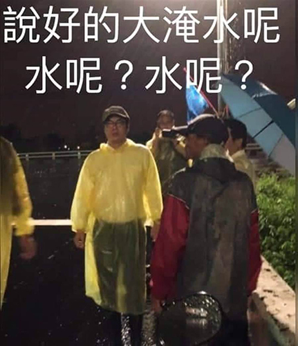 此图被“韩粉”笑翻,在陈其迈照片上打字“说好的大淹水呢?水呢?水呢?”(图片取自台媒)
