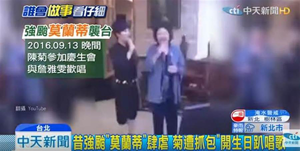 高雄前市长陈菊,2016年的强台风“莫兰蒂”过境时高雄灾情严重,她晚上却参加朋友庆生会,还和台湾歌手詹雅雯开心唱歌。(图片取自台媒)