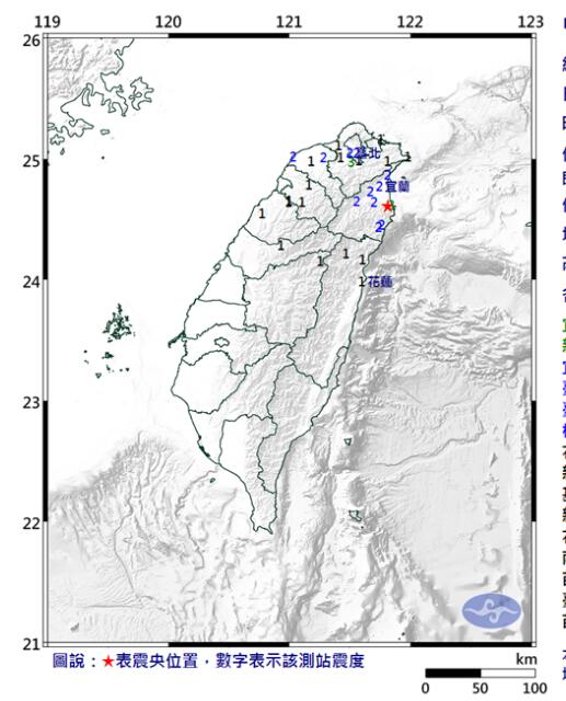 然而,这起地震后,早晨7时02分左右,宜兰苏澳又发生4.6级地震,震中位于宜兰县政府南偏东方14.8公里,地震深度为66.4公里。各地最大震度宜兰县苏澳、新北市新店3级。台北、桃园2级。花莲、基隆、新竹、南投、苗栗、台中1级。(中国台湾网 李宁)