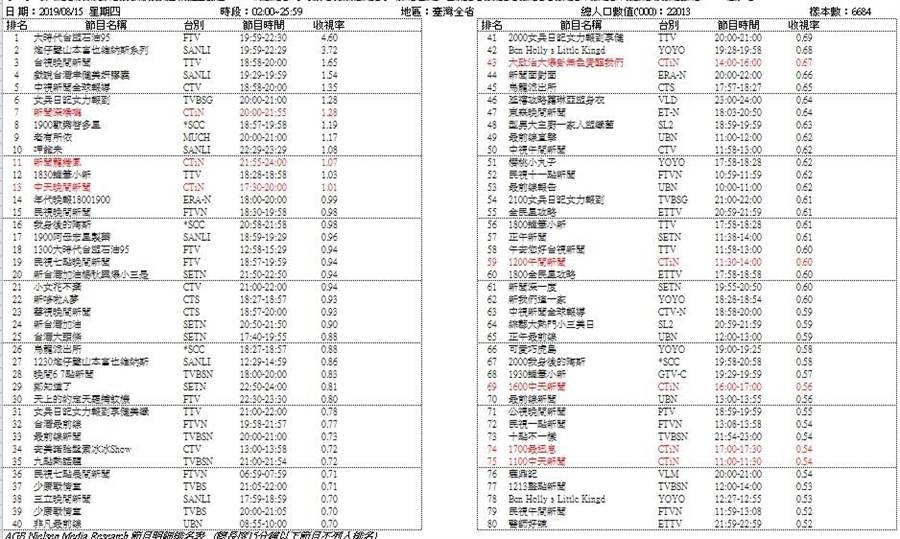 不仅如此,根据这份收视排行,“中天新闻台”政论节目《新闻龙卷风》也勇夺全台同类型收视第2佳绩,仅次自家的《新闻深喉咙》。此外,同门的《中天晚间新闻》,收视也大胜“独媒”们。收视率会说话,这结果反映台湾民众心声。