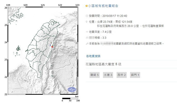 今天上午11时20分,在花莲县政府南偏西方28.8公里处发生里氏规模3.3级有感地震。(图片取自台媒)